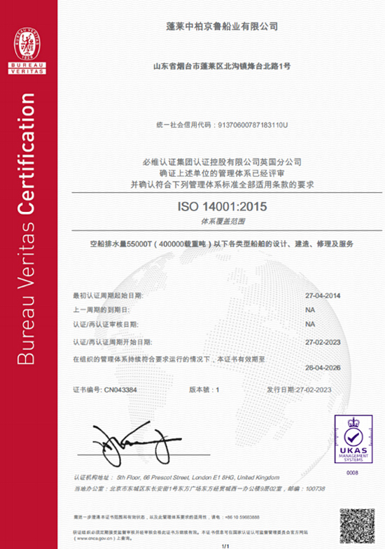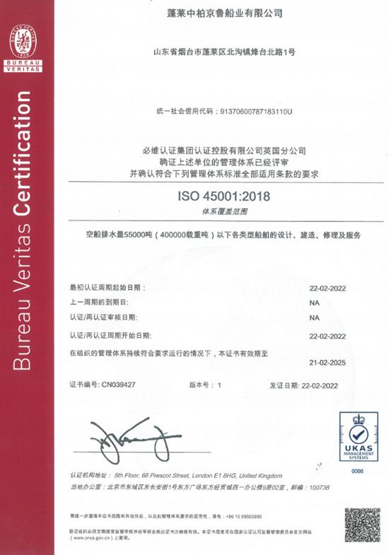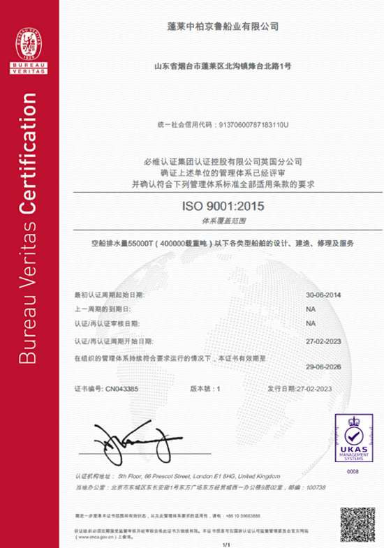 公司依據(jù)GB/T19001-2008質(zhì)量管理體系要求,建立了京魯船廠質(zhì)量管理體系,并于2008年通過ISO9001:2008質(zhì)量管理體系認證。隨著質(zhì)量管理體系標準的換版,公司隨之編制并頒布了新版《質(zhì)量手冊》及《質(zhì)量管理體系程序文件》等文件,并貫徹實施。公司于2017年完成了ISO9001:2015版的質(zhì)量管理體系換證審核。